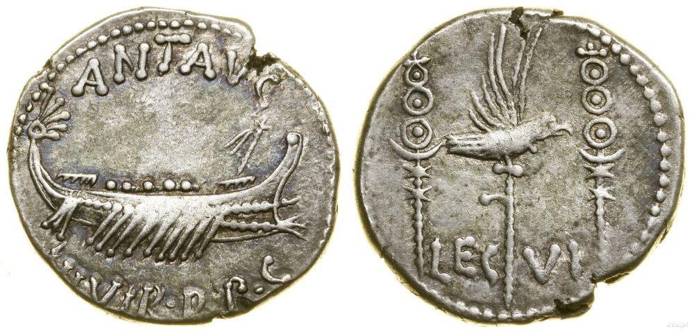 Opis: | Republika Rzymska - Marek Antoniusz - okres triumwiratu i walki o władzę 43–27 pne, denar, (32–31 pne), mennica ruchoma, Aw: Galera w prawo, u góry ANT AVG, u dołu III VIR R P C, Rw: Aquila (orzeł legionowy) pomiędzy dwoma sztandarami obozowymi, w polu LEG VI |