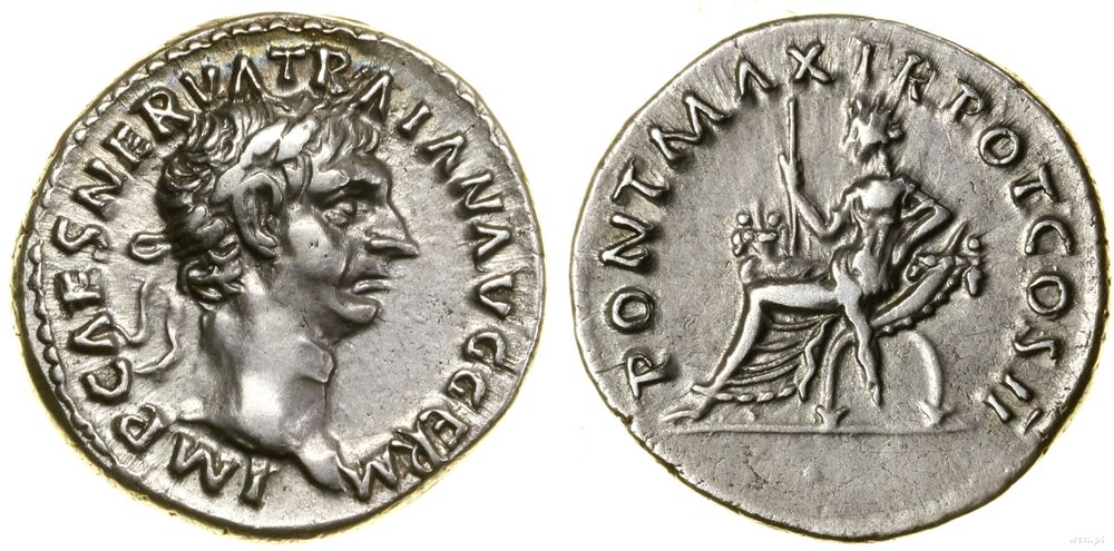 Opis: | Cesarstwo Rzymskie - Trajan (98–117), denar, (98–99), Rzym, Aw: Głowa cesarza w wieńcu laurowym w prawo, IMP CAES NERVA TRAIAN AVG GERM, Rw: Abundantia siedząca w lewo, trzymająca berło, róg obfitości oparty o krzesło, PONT MAX TR POT COS II |