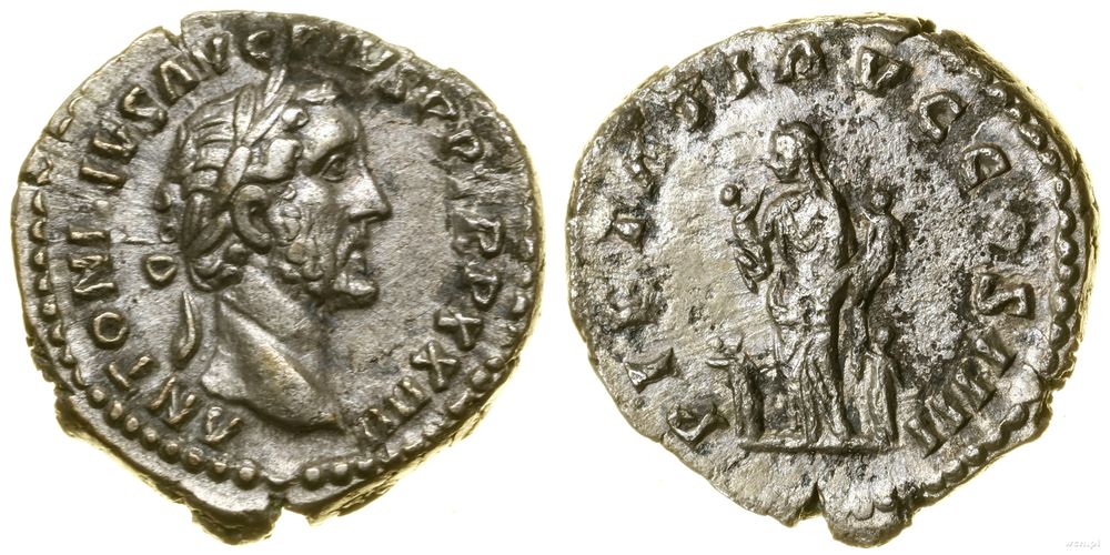 Opis: | Cesarstwo Rzymskie - Antoniusz Pius (138–161), denar, 160–161, Rzym, Aw: Głowa cesarza w wieńcu laurowym w prawo, ANTONINVS AVG PIVS P P TR P XXIIII, Rw: Pietas stojąca pomiędzy dwoma dziećmi, kolejne trzyma na obu rękach, PIETATI AVG COS IIII |