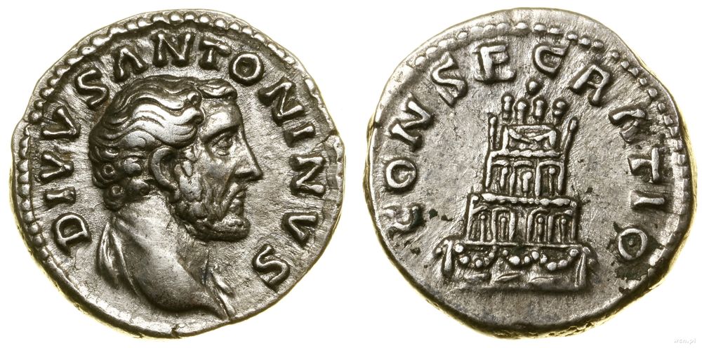 Opis: | Cesarstwo Rzymskie - Antoniusz Pius (138–161), denar pośmiertny, (od 161), Rzym, Aw: Głowa cesarza w prawo, DIVVS ANTONINVS; Rw: Stos pogrzebowy złożony z czterech kondygnacji, CONSECRATIO |
