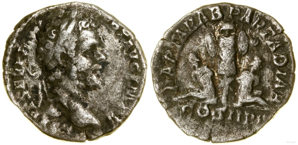 Opis: | Cesarstwo Rzymskie - Septymiusz Sewer (193–211), denar, 195, Rzym, Aw: Popiersie cesarza w wieńcu laurowym w prawo, L SEPT SEV PERT AVG IMP V, Rw: Trofeum, po bokach jeńcy, PART ARAB PART ADIAB, w odcinku COS II P P |