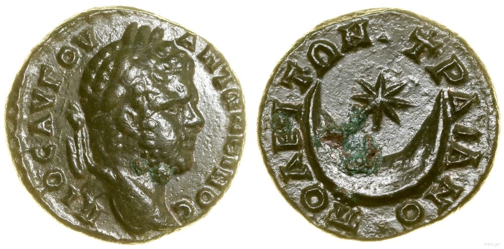 Opis: | Rzym prowincjonalny - Tracja - Traianopolis - Karakalla (198–217), brąz (hemiassarion), (198–217), Aw: Głowa władcy w prawo, ANTΩNEINOC ΠIOC AYΓO, Rw: Gwiazda, poniżej półksiężyc, TPAIANOΠOΛEITΩN |