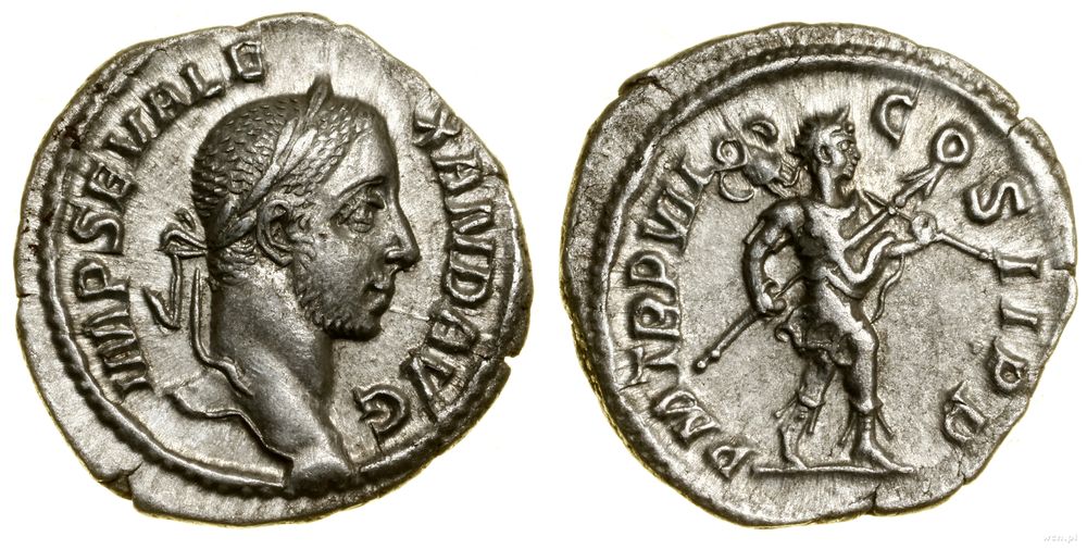 Opis: | Cesarstwo Rzymskie - Aleksander Sewer (222–235), denar, 228, Rzym, Aw: Popiersie cesarza w wieńcu laurowym, IMP SEV ALEXAND AVG, Rw: Kroczący Romulus, niesie włócznię i trofeum, P M TR P VII COS II P P |