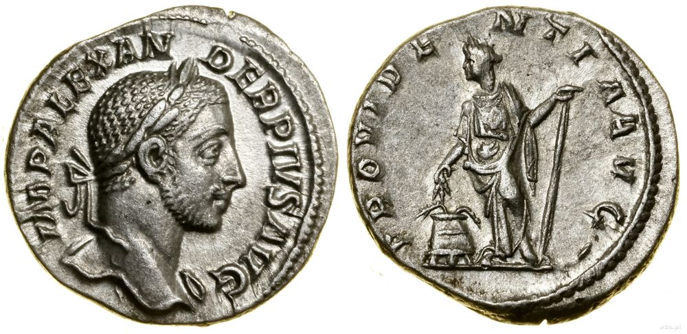 Opis: | Cesarstwo Rzymskie - Aleksander Sewer (222–235), denar, (231–235), Rzym, Aw: Głowa cesarza w wieńcu laurowym w prawo, IMP ALEXANDER PIVS AVG, Rw: Providentia stojąca w lewo, trzymająca kłosy zboża nad modiusem oraz róg obfitości, PROVIDENTIA AVG |
