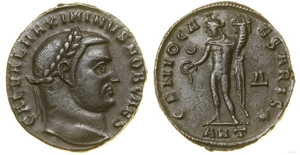 Opis: | Cesarstwo Rzymskie - Maksymin II Daja (305–313) - jako cezar 305–310, follis, 308–309, Antiochia, Aw: Głowa cezara w prawo, GAL VAL MAXIMINVS NOB CAES; Rw: Geniusz stojący w lewo,trzymający paterę oraz róg obfitości, za plecami Δ, GENIO CAESARIS, w odcinku ANT |
