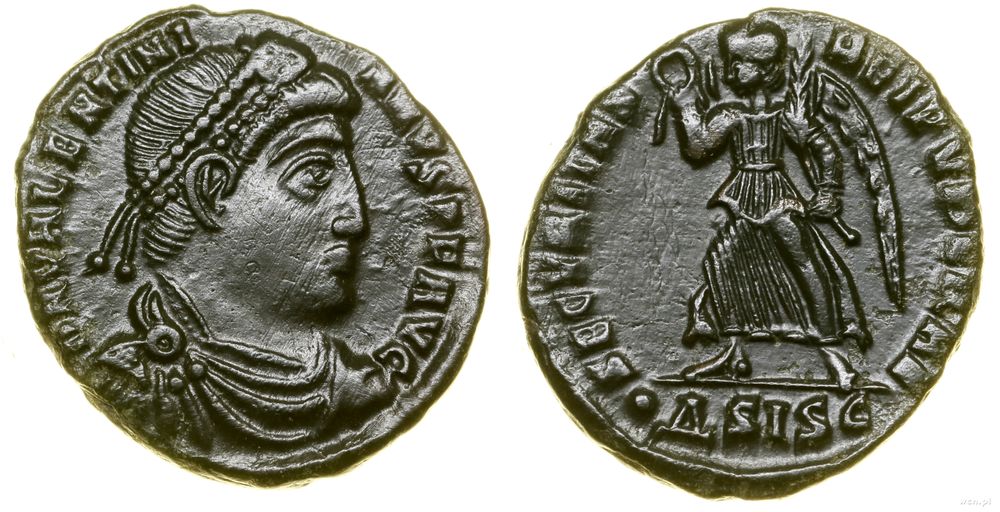 Opis: | Cesarstwo Rzymskie - Walentynian I (364–375), follis, (364–367), Siscia, Aw: Popiersie w prawo, D N VALENTINIANVS P F AVG, Rw: Wiktoria krocząca w lewo, trzymająca wieniec i gałązkę palmową, SECVRITAS REIPVBLICAE, w odcinku •ΔSISC |