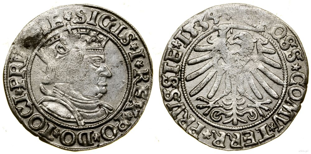 Opis: | Polska - Zygmunt I Stary (1506–1548) - monety pruskie, grosz, 1534, Toruń, popiersie króla z długimi włosami, w koronie, końcówki legend PRVSSIE / PRVSSIE |