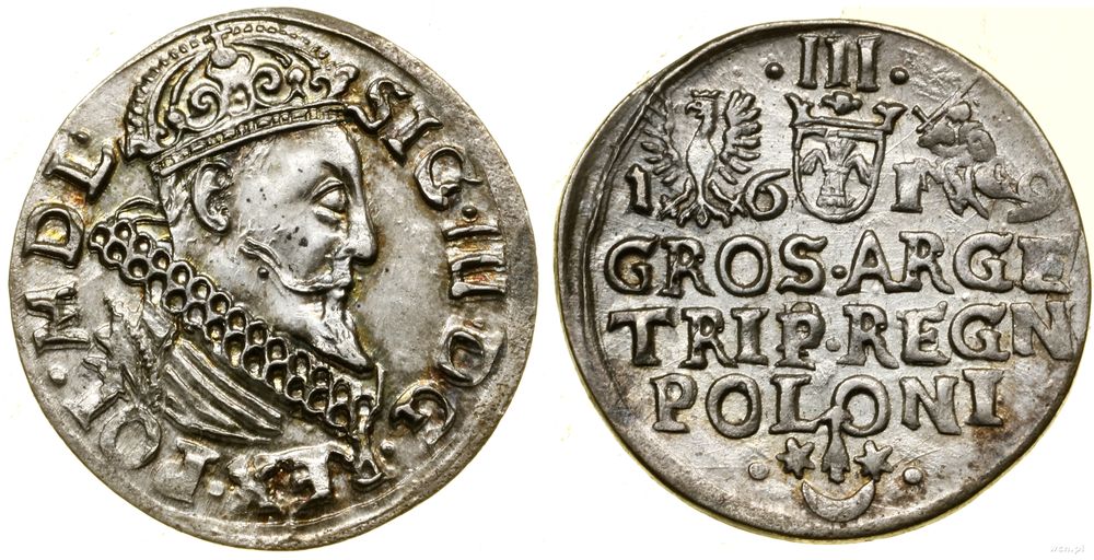 Opis: | Polska - Zygmunt III Waza (1587–1632) - monety koronne, trojak, 1619, Kraków, na awersie SIG III, na rewersie POLONI |