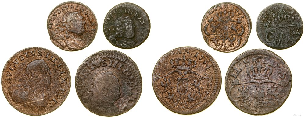 Opis: | Polska - August III (1733–1763), lot 4 monet, 1. 2 x 1 grosz - 1754 (3), 1755 (?) 2. 2 x szeląg - 1751 (S) oraz data nieczytelna |