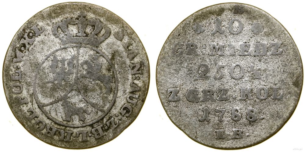 Opis: | Polska - Stanisław August Poniatowski (1764–1795) - monety koronne, 10 groszy miedziane, 1788 EB, Warszawa, wariant z kropkami po 1/2, dacie i literze B na rewersie |