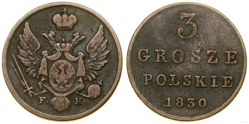 Opis: | Polska - Królestwo Kongresowe (1815–1835) - Mikołaj I (1825–1855), 3 grosze polskie, 1830 FH, Warszawa, odmiana z literami FH pod Orłem (mincerz Fryderyk Hunger) |