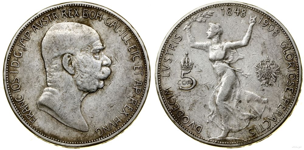 Opis: | Austria - Franciszek Józef I (1848–1916), 5 koron, 1908, Wiedeń, 60-lecie panowania Franciszka Józefa I |