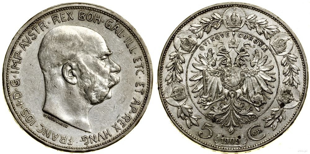 Opis: | Austria - Franciszek Józef I (1848–1916), 5 koron, 1909, Wiedeń, popiersie autorstwa St. Schwartza |
