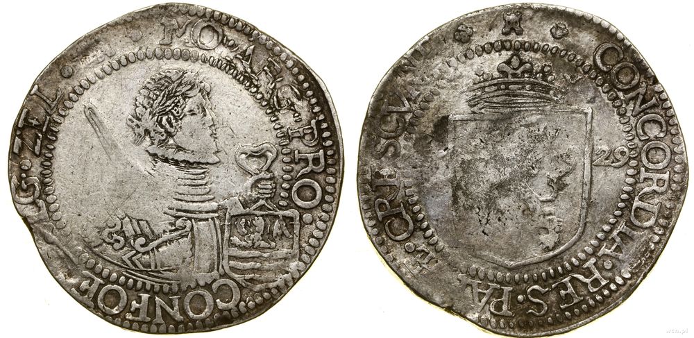 Opis: | Niderlandy - Zelandia, talar (rijksdaalder), 1629, Aw: Półpostać władcy stojącego w prawo, trzymającego miecz oraz wstęgę z przymocowaną tarczą herbową, legenda; Rw: Ukoronowana tarcza herbowa, po bokach data, legenda |