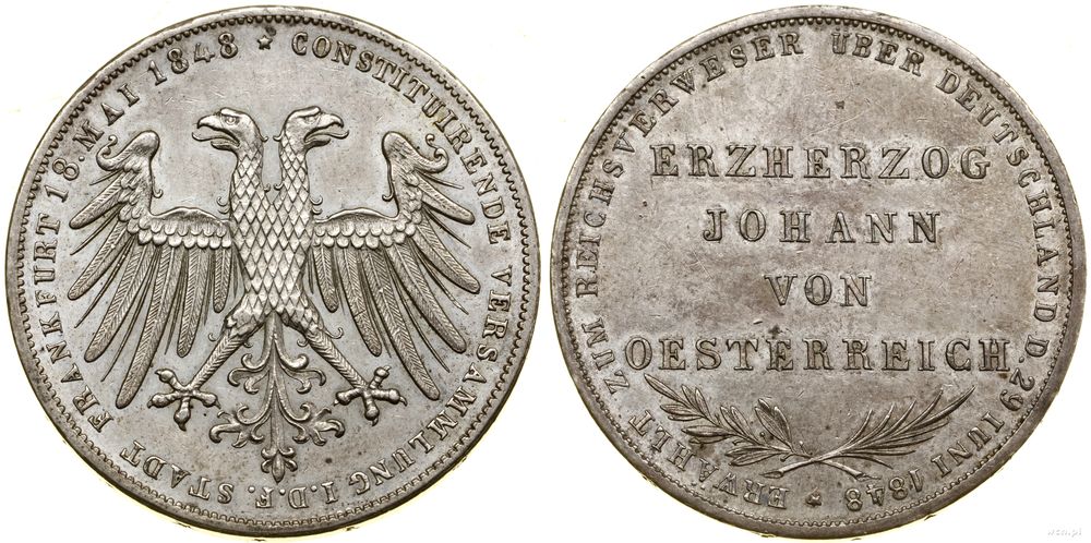 Opis: | Niemcy - Frankfurt – miasto, 2 guldeny (Doppelgulden), 1848, Frankfurt, wybite z okazji wyboru Jana Austriackiego na regenta Rzeszy |