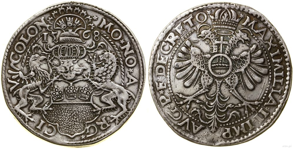 Opis: | Niemcy - Kolonia – miasto - Maksymilian II, talar, 1568, Kolonia, Aw: Tarcza herbowa, powyżej hełm z klejnotem przedziela datę, MO NO A CIV COLON, Rw: Ukoronowany dwugłowy orzeł z jabłkiem panowania na piersi, MAXIMILIA II IMP AVG P F DECRETO |