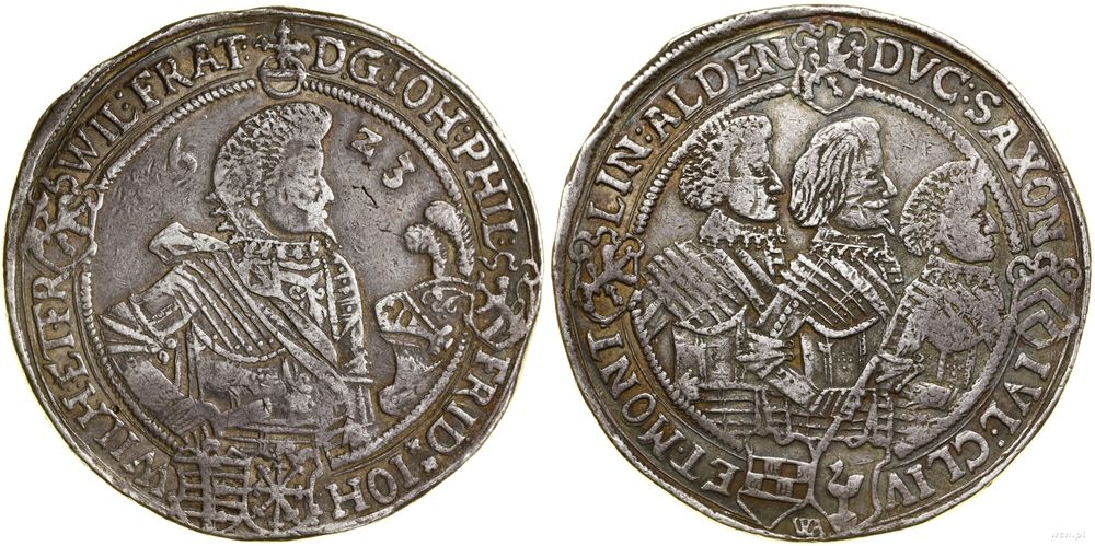 Opis: | Niemcy - Saksonia-Altenburg - Jan Filip, Fryderyk, Jan Wilhelm i Fryderyk Wilhelm II (1603–1625), talar, 1623, Saalfeld, Aw: Półpostać władcy w zbroi w prawo, po bokach data 16 - 23, D G IOH PHIL FRID IOH WILH ET FR WIL FRAT, Rw: Półpostacie trzech władców w zbrojach, w prawo, DVC SAXON IVL CLIV ET MONT LIN ALDEN |