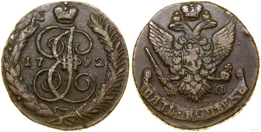 Opis: | Rosja - Katarzyna II (1762–1796), 5 kopiejek, 1792 AM, Anninsk |