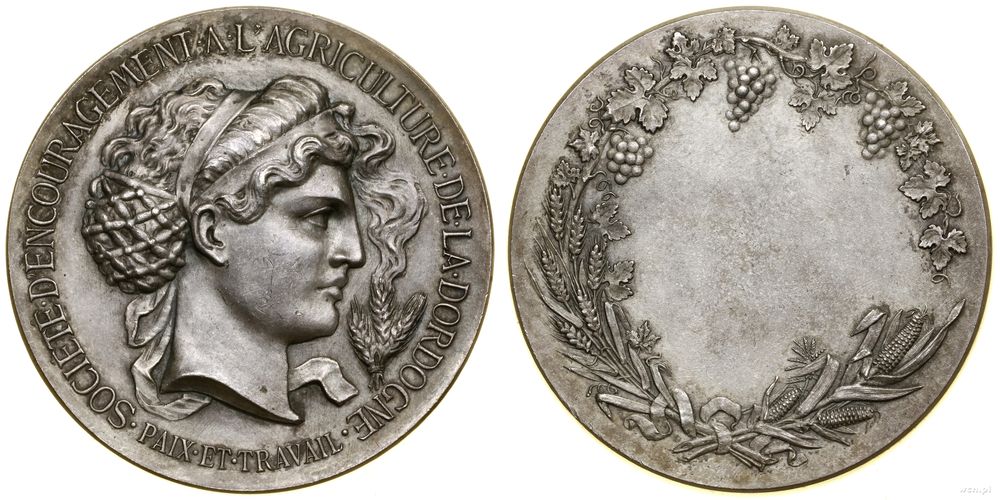 Opis: | Francja - III Republika (1871–1940), medal nagrodowy Towarzystwa Rolniczego, Aw: Głowa w prawo, przed nią płonący kłos zboża, • SOCIÉTÉ • D'ECOURAGEMENT • A • L'AGRICULTURE • DE • LA • DORDOGNE • - PAIX• ET • TRAVAIL, Rw: Wieniec, Obrzeże: Punca ARGENT |