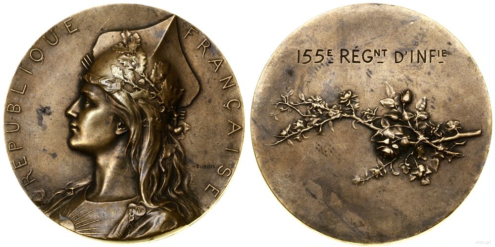 Opis: | Francja - III Republika (1871–1940), medal pamiątkowy 155. regimentu piechoty, pocz. XX w., Aw: Popiersie w lewo, po prawej sygnatura H.DUBOIS (Heni Dubois 1859–1930), REPUBLIQUE - FRANÇAISE, Rw: Gałązka, wyżej 155-E REG-NT D'INF-IE, Obrzęze: Punca BRONZE |