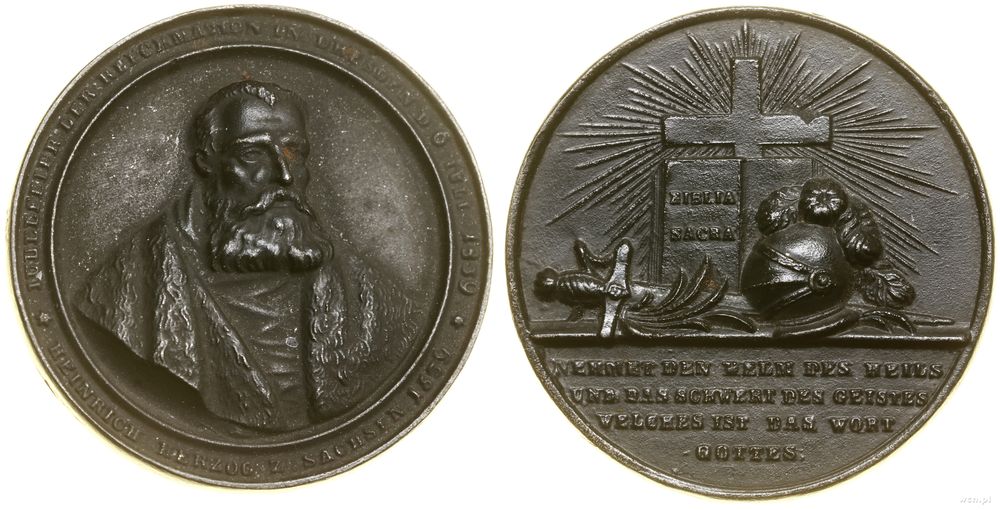 Opis: | Niemcy - Saksonia, 300. rocznica Reformacji w Dreźnie, 1839, Drezno, Aw: Popiersie Marcina Lutra lekko w prawo, HEINRICH HERZOG Z. SACHSEN. 1539. - JUBELFEIER DER REFORMATION IN DRESDEN D 6 IULI 1839, Rw: Krzyż, biblia, hełm i miecz, w odcinku NEHMET DEN HELM DES HEILS / UND DAS SCHWERT DES GEISTES / WELCHES IST DAS WORT / GOTTES |