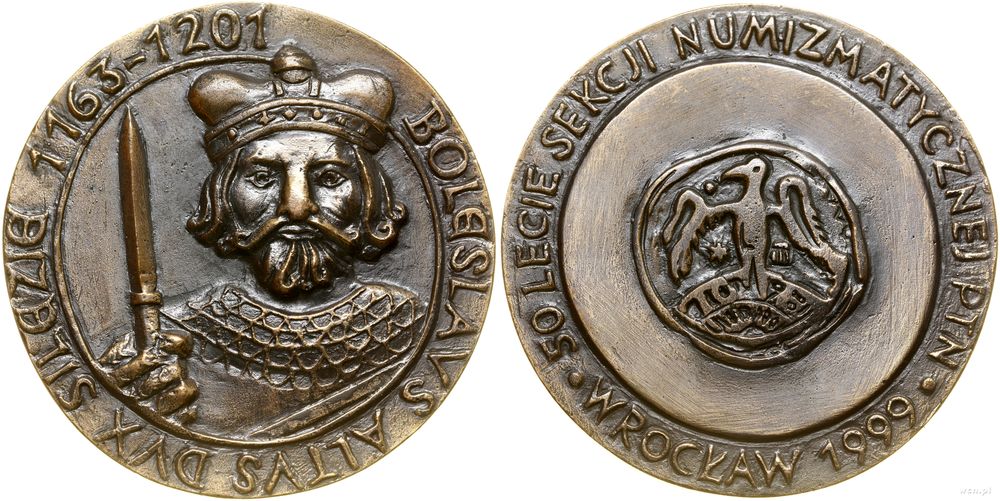 Opis: | Polska - III Rzeczpospolita Polska (od 1989), Bolesław Wysoki, 1999, Aw: Popiersie na wprost, w prawej ręce włócznia, BOLESLAVS ALTVS DVX SILEZIE 1163-1201, Rw: Wizerunek brakteata Bolesława, 50 LECIE SEKCJI NUMIZMATYCZNEJ PTN • WROCŁAW 1999 • |