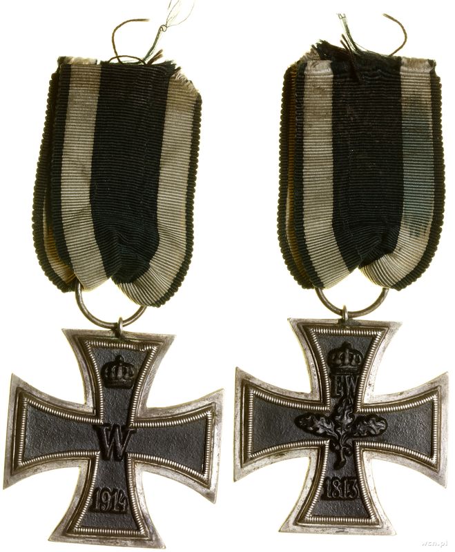 Opis: | Niemcy - Prusy - Wilhelm II (1888–1918), Krzyż Żelazny II Klasy wz. 1914, Berlin, Krzyż, na środku którego litera W, na górnym ramieniu korona, na dolnym ramieniu 1914, na stronie odwrotnej na środku trzy liście dębu, nad nimi korona i FW, na dolnym ramieniu 1813, dznaczenie trzyczęściowe, mocowane na wstążkę |