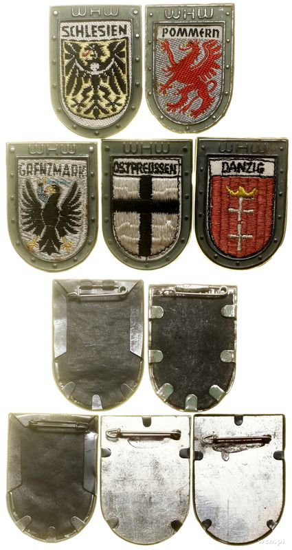 Opis: | Niemcy - III Rzesza (1933–1945), 5 x wpinka Pomocy Zimowej (Winterhilfswerk), 1936, Wpinka z serii Herby okręgów pogranicznych (Grenzlandwappen) rozdawanej podczas zbiórki w dniach 17–18.10.1936 przeprowadzonej w całej Rzeszy, w skład zestawu wchodzi: Prusy Wschodnie (Ostpreussen), Gdańsk (Danzig), Pomorze (Pommern), Marchia Graniczna Poznańsko-Zachodniopruska (Grenzmark), Śląsk (Schlesien) |