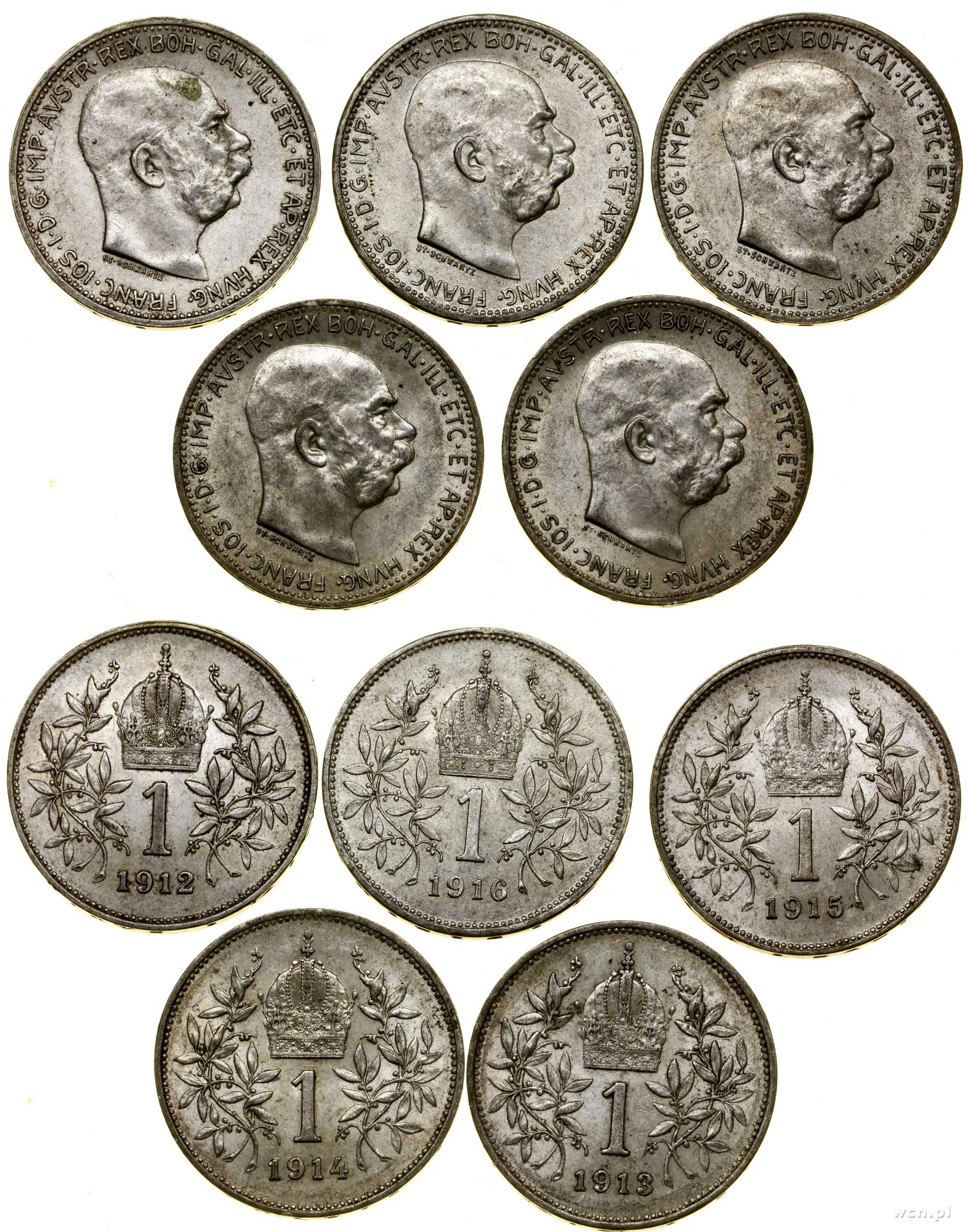 Austria, zestaw 5 x 1 korona, 1912, 1913, 1914, 1915, 1916