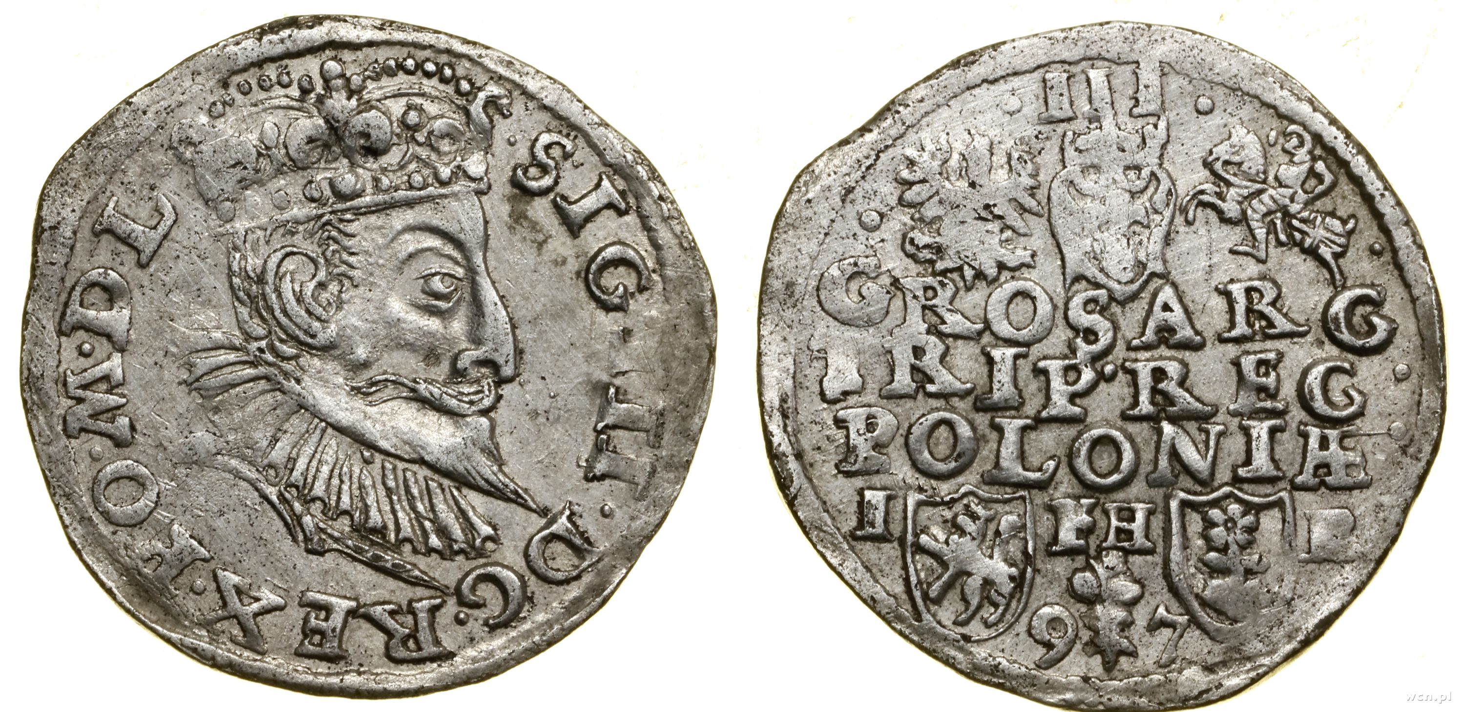 korona z wąskim rondem, napis na awersie SIG III, na rewe... | III |