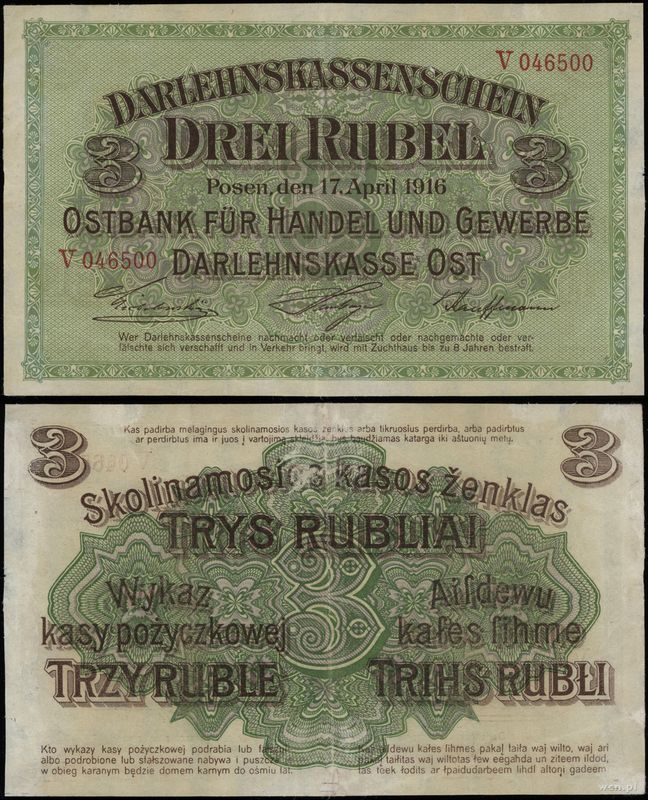 Opis: | Polska - Banknoty niemieckich władz okupacyjnych (1915–1918) - Ostbank für Handel und Gewerbe, Darlehnskasse Ost, Posen, 3 ruble, 17.04.1916, Poznań, seria V, numeracja 046500 |