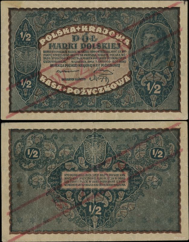 Opis: | Polska - II Rzeczpospolita Polska (1918–1939) - emisje przed reformą Władysława Grabskiego, 1/2 marki polskiej, 7.02.1920, bez oznaczenia serii i numeracji, czerwony nadruk WZÓR (wznoszący) |