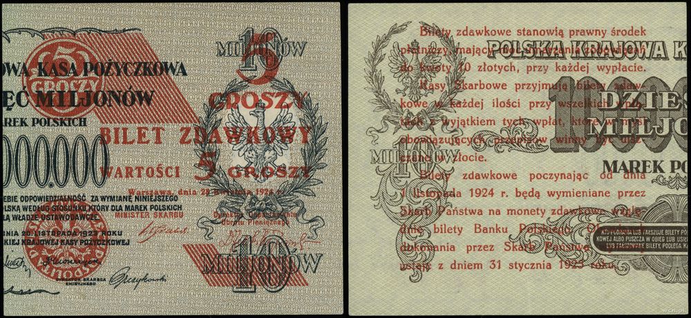 Opis: | Polska - II Rzeczpospolita Polska (1918–1939) - emisje po reformie Władysława Grabskiego, bilet zdawkowy – 5 groszy, 28.04.1924, nadruk na prawej części banknotu 10.000.000 mkp, bez oznaczenia serii i numeracji |