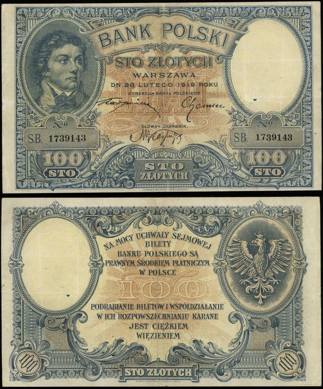 Opis: | Polska - II Rzeczpospolita Polska (1918–1939) - emisje po reformie Władysława Grabskiego, 100 złotych, 28.02.1919, seria B, numeracja 1739143 |