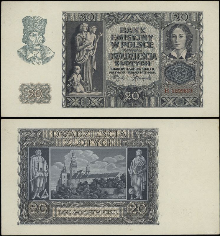 Opis: | Polska - Generalna Gubernia (1939–1945) - Bank Emisyjny w Polsce, 20 złotych, 1.03.1940, seria H, numeracja 1699821 |