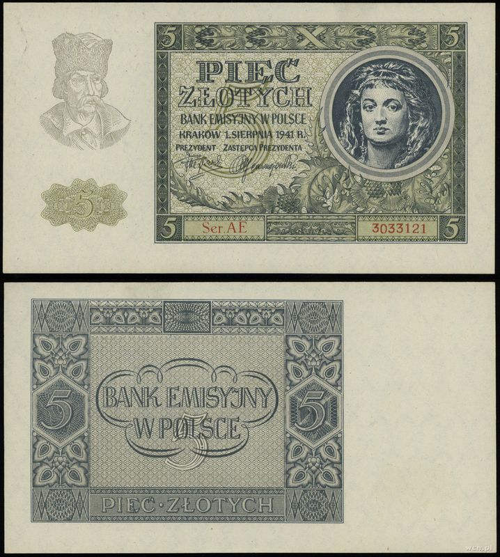 Opis: | Polska - Generalna Gubernia (1939–1945) - Bank Emisyjny w Polsce, 5 złotych, 1.08.1941, seria AE, numeracja 3033121 |