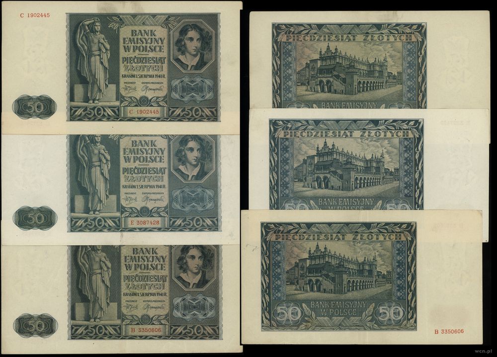 Opis: | Polska - Generalna Gubernia (1939–1945) - Bank Emisyjny w Polsce, zestaw: 3 x 50 złotych, 1.08.1941, różne serie: B, C, E |