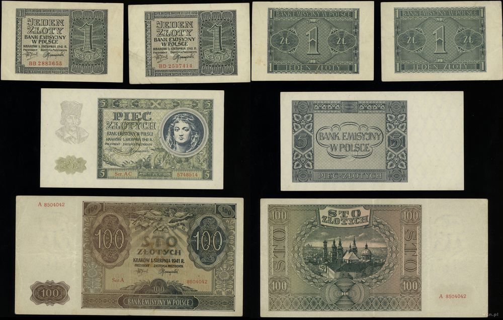 Opis: | Polska - Generalna Gubernia (1939–1945) - Bank Emisyjny w Polsce, zestaw 4 banknotów, 1.08.1941, w zestawie: 2 x 1 złoty: serie BB, BD, 5 złotych seria AC, 100 złotych seria A |