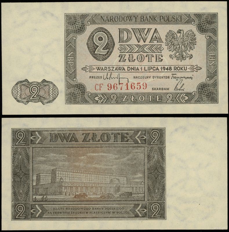 Opis: | Polska - Polska powojenna (1944–1952), 2 złote, 1.07.1948, seria CF, numeracja 9671659, znak wodny z plecionką jasną w ciemnym okręgu |