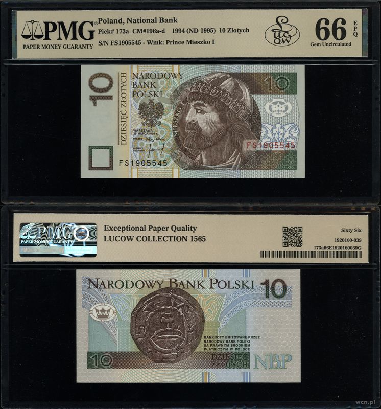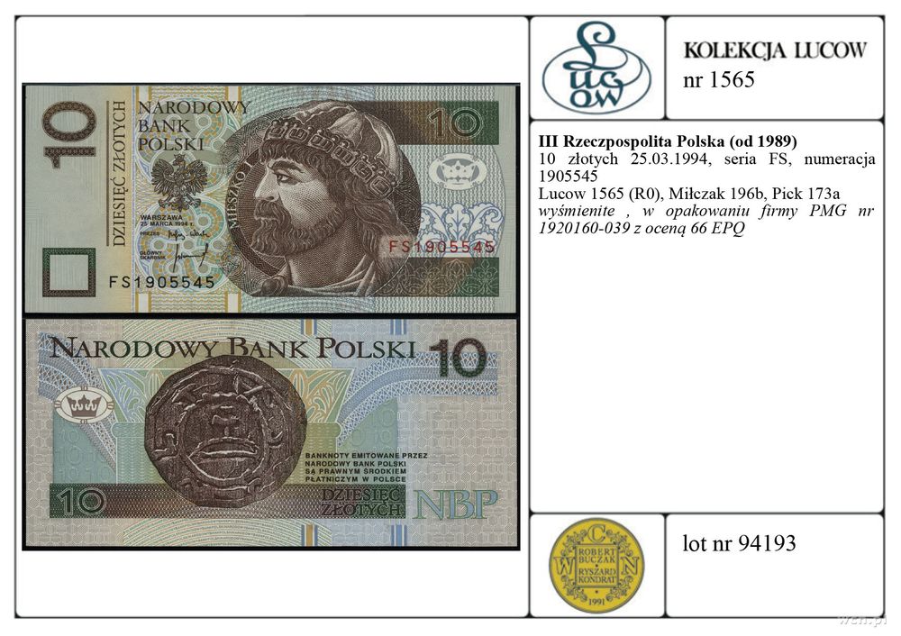 Opis: | Polska - III Rzeczpospolita Polska (od 1989), 10 złotych, 25.03.1994, seria FS, numeracja 1905545 |