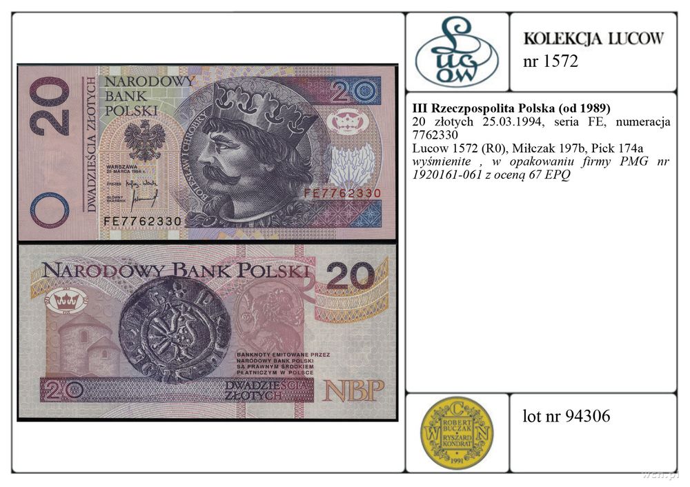 Opis: | Polska - III Rzeczpospolita Polska (od 1989), 20 złotych, 25.03.1994, seria FE, numeracja 7762330 |