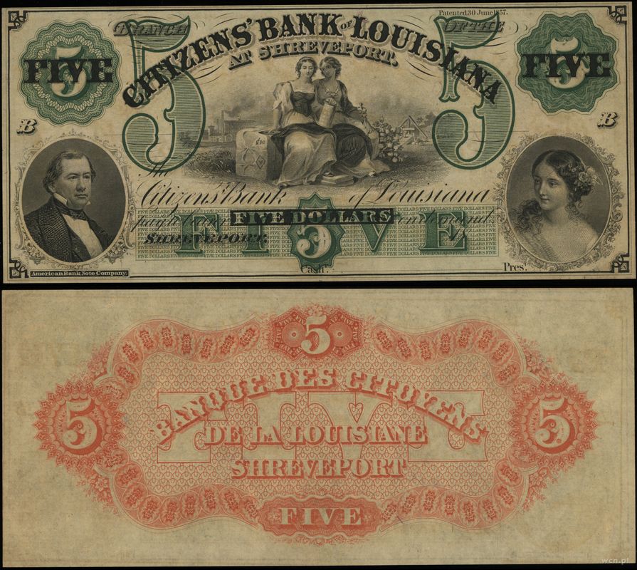 Opis: | Stany Zjednoczone Ameryki (USA) - Louisiana - Citizen’s Bank of Lousiana - At Shreveport, 5 dolarów, 18... (po roku 1860), seria B, druk niewypełniony - blanco |