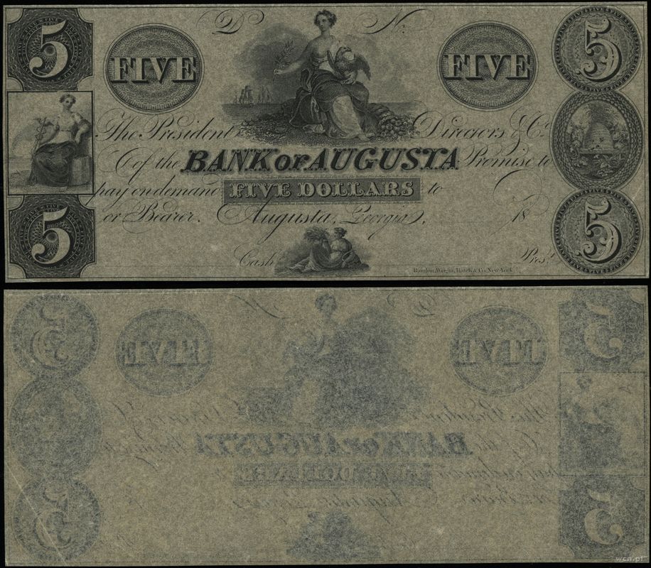 Opis: | Stany Zjednoczone Ameryki (USA) - Georgia - Augusta - Bank of Augusta, 5 dolarów, 18... (lata 30 oraz 50'), seria D, druk niewypełniony - blanco |
