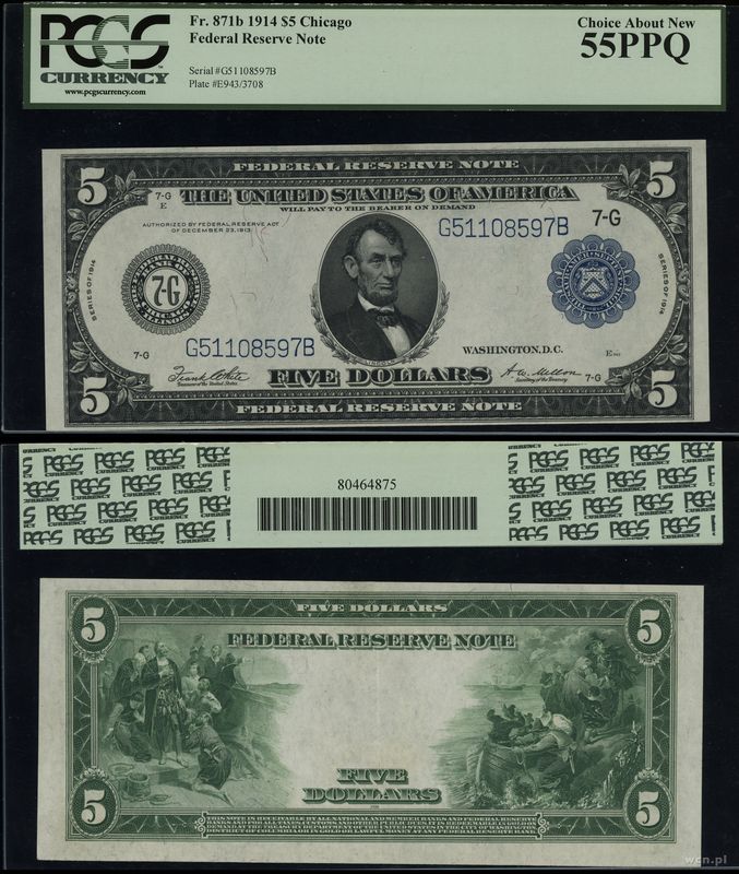 Opis: | Stany Zjednoczone Ameryki (USA) - Federal Reserve Note - Chicago, 5 dolarów, 1914, seria G 51108597 B, niebieska pieczęć, podpisy: White i Mellon |