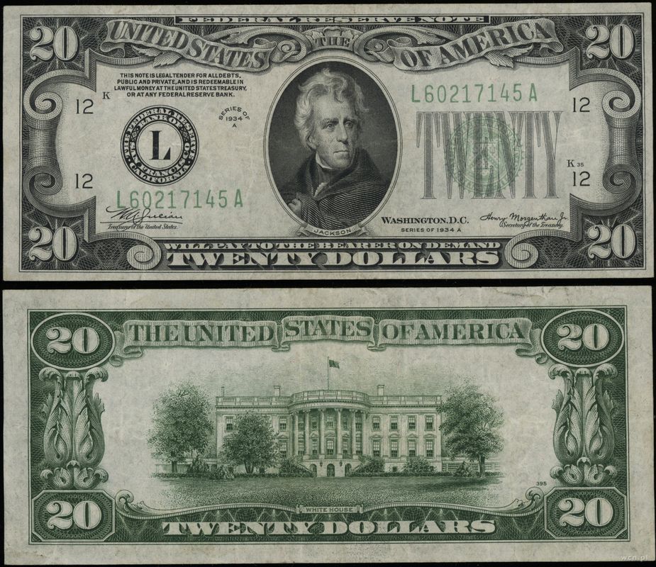 Opis: | Stany Zjednoczone Ameryki (USA) - Federal Reserve Note - New York, 20 dolarów, 1934, seria L 60217145 A, zielona pieczęć, podpisy Julian, Morgenthau |