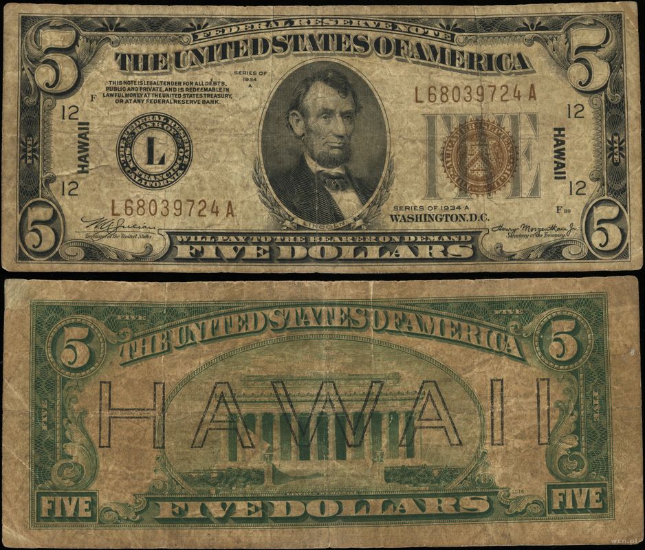 Opis: | Stany Zjednoczone Ameryki (USA) - Federal Reserve Note - Hawaii, 5 dolarów, 1934, seria L 68039724 A, podpisy Julian i Morgenthau, brązowa pieczęć |