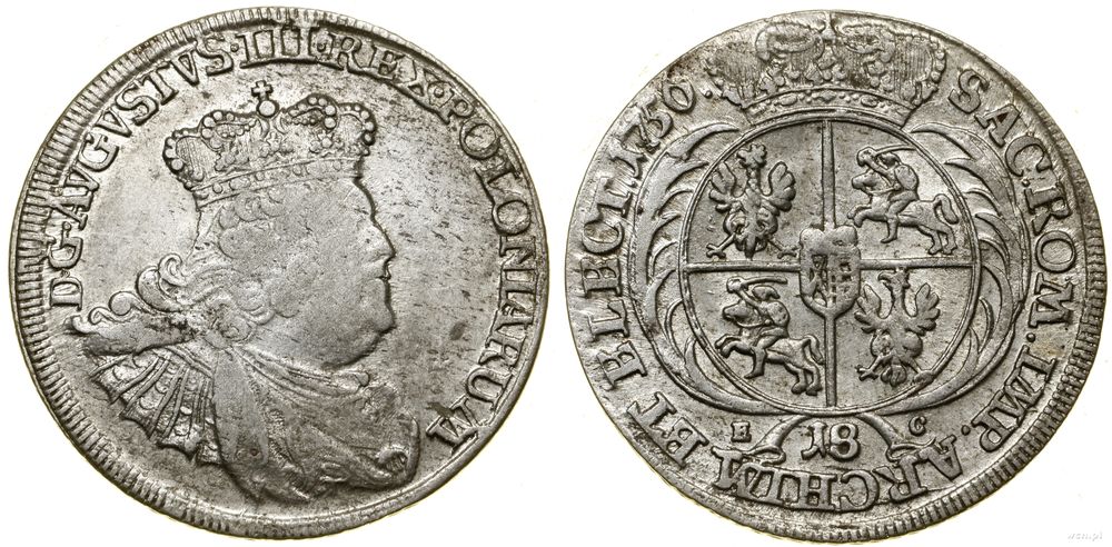 Opis: | Polska - August III (1733–1763) - monety polsko-saskie, ort, 1756 EC, Lipsk, typ portretowy "mała głowa", krzyżyk globu korony celuje w środek podstawy pierwszej I w legendzie, pola korony pionowo żeberkowane |