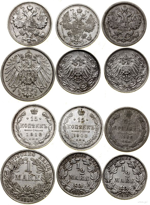 Europa - różne, zestaw 6 monet (3 x rosyjska, 3 x niemiecka), 1905–1919