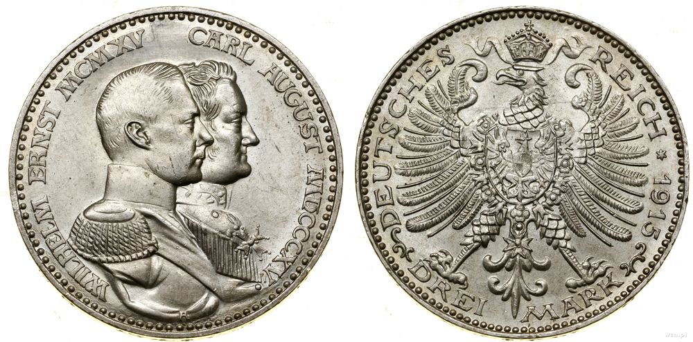 Opis: | Niemcy - Saksonia-Weimar-Eisenach - Wilhelm Ernest (1901–1918), 3 marki, 1915 A, Berlin, Moneta wybita z okazji stulecia księstwa 1915 / Anläßlich der Jahrhundertfeier des Großherzogtums 1915 |