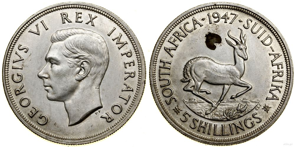 Opis: | Republika Południowej Afryki - Jerzy VI (1936–1952), 5 szylingów, 1947, Pretoria |
